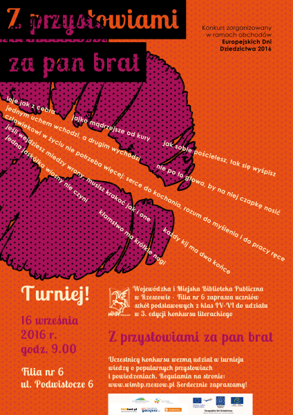 Uczestnicy konkursu wezmą udział w turnieju wiedzy o popularnych przysłowiach i powiedzeniach w dniu 16 września 2016 r. o godz. 9.00, Filia nr 6, ul. Podwisłocze 6.