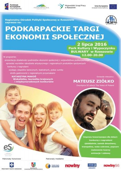 Regionalny Ośrodek Polityki Społecznej w Rzeszowie serdecznie zaprasza mieszkańców województwa na Podkarpackie Targi Ekonomii Społecznej, które odbędą się 2 lipca 2016 r. w godz. 12.00 – 20.00, w Parku Kultury i Wypoczynku „Bulwary” w Rzeszowie.