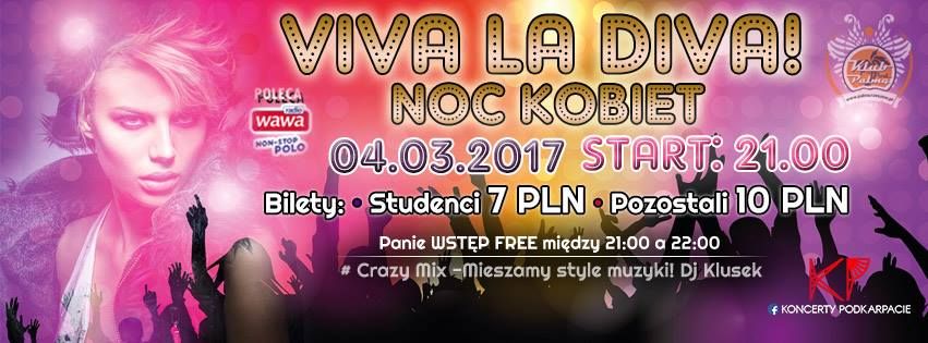 VIVA LA DIVA!" to obowiązkowa pozycja dla wszystkich prawdziwych kobiet. Z naszej strony zapewniamy jak zawsze najlepiej wyselekcjonowaną muzykę, pyszne drinki oraz wyjątkową atmosferę.