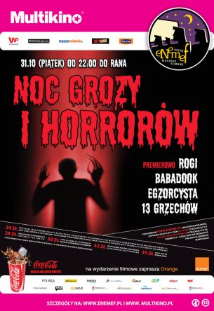 ENEMEF: NOC GROZY I HORRORÓW odbędzie się 31 października (piątek) jednocześnie w 30 Multikinach w Polsce: Bydgoszcz, Czechowice-Dziedzice, Elbląg, Gdańsk, Gdynia, Katowice, Kielce, Koszalin, Kraków, Lublin, Łódź, Olsztyn, Poznań Malta, Poznań 51, Radom, Rumia, Rybnik, Rzeszów, Słupsk, Szczecin, Tychy, Warszawa Targówek, Warszawa Wola, Warszawa Złote Tarasy, Warszawa Ursynów, Włocławek, Wrocław Arkady, Wrocław Pasaż Grunwaldzki, Zabrze, Zgorzelec.