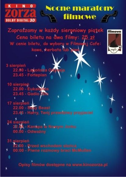 3 sierpnia w kinie Zorza rusza cykl "Nocnych Maratonów FIlmowych". W każdy sierpnioy piątek kino wyświetli dwa filmy. Pełny harmonogram znajdziecie poniżej.