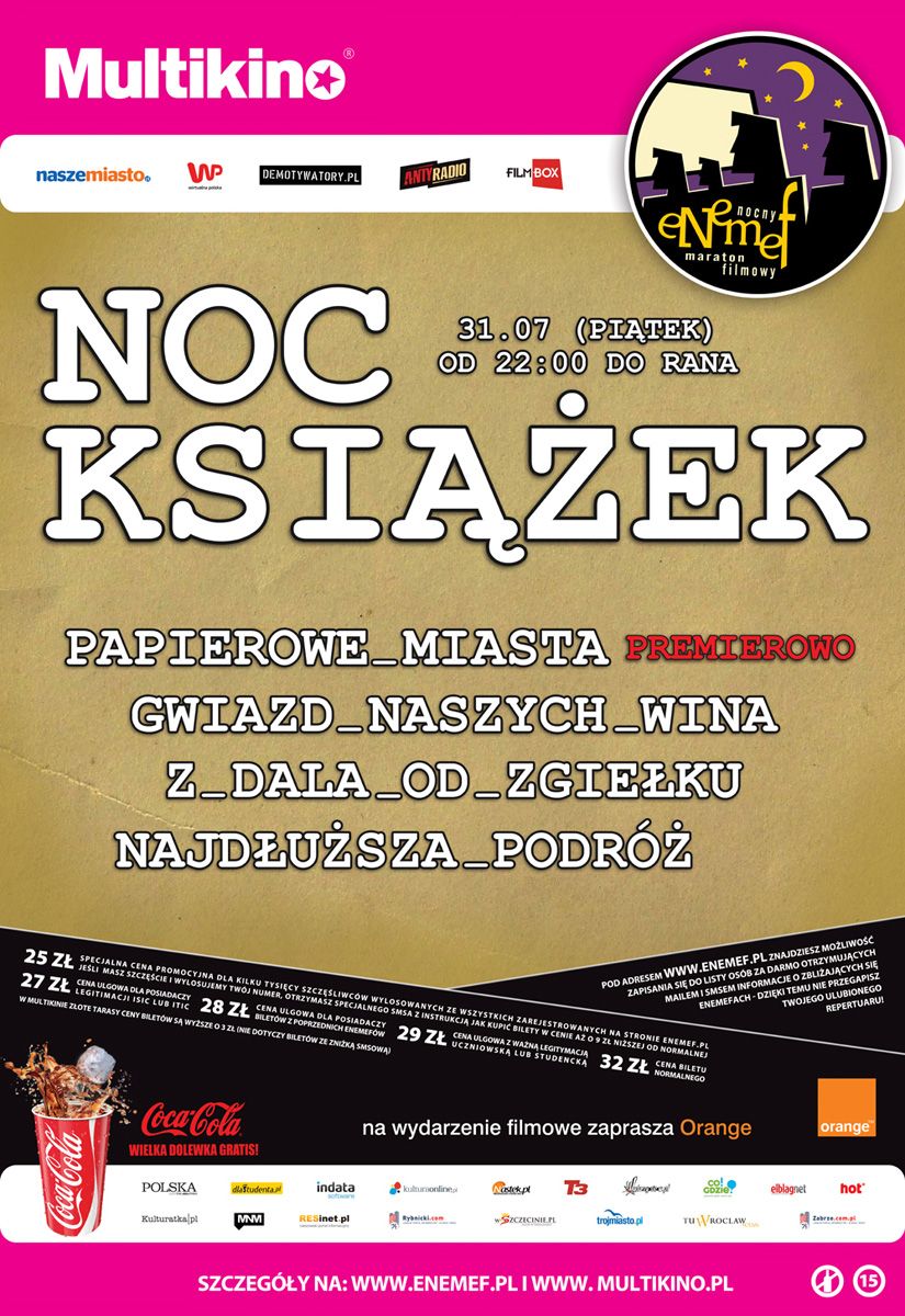 ENEMEF: Noc Książek odbędzie się 31 lipca 2015 r. (piątek) w 26 Multikinach w Polsce: Bydgoszcz, Gdańsk, Gdynia, Katowice, Kielce, Koszalin, Kraków, Lublin, Łódź, Olsztyn, Poznań Stary Browar, Poznań Malta, Rumia, Rybnik, Rzeszów, Słupsk, Szczecin, Tychy, Warszawa Targówek, Warszawa Wola, Warszawa Złote Tarasy, Warszawa Ursynów, Włocławek, Wrocław Arkady Wrocławskie, Wrocław Pasaż Grunwaldzki, Zabrze.