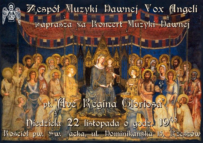 Muzycy kościelni obchodzą wielkie święto swojej patronki. Z tej okazji, 22 listopada po mszy świętej u Dominikanów odbędzie się koncert muzyki dawnej pt. „Ave Regina Gloriosa”. Usłyszycie średniowieczne pieśni z południa Europy, zaczerpnięte z manuskryptów pochodzących z Włoch, Hiszpanii, Katalonii. Zanurzymy się w wyjątkowy klimat pieśni z Laudario di Cortona (XIII w.), Cantigas de Santa Maria (XIII w.), oraz Llibre Vermell de Montserrat z XIV w. Pieśni zostaną wykonane z akompaniamentem kopii średniowiecznych instrumentów pochodzących z Pracowni Leszka Pelca „Caelo et terra”. Po koncercie nastąpi prezentacja instrumentarium.