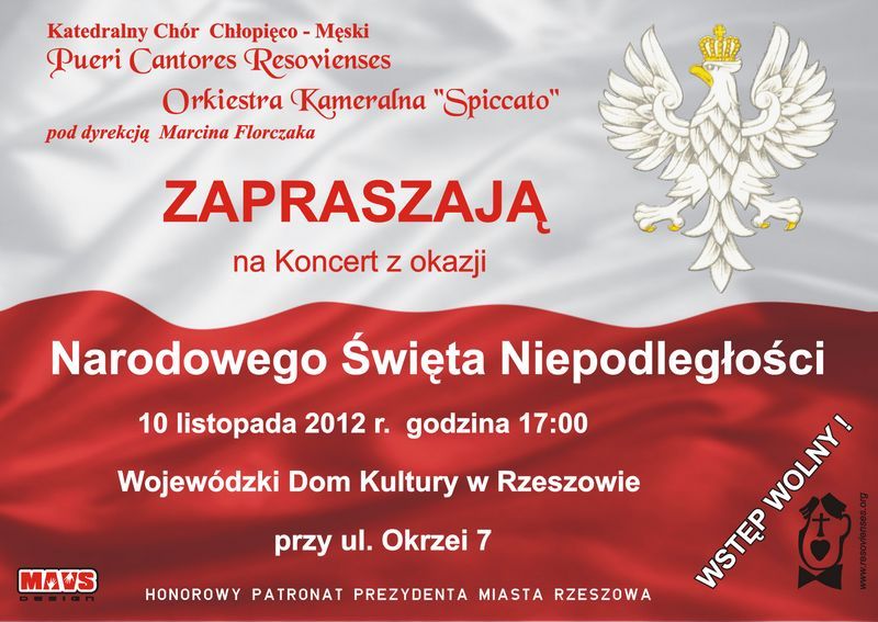 Katedralny Chór Chłopięco-Męski Pueri Cantores Resovienses oraz Orkiestra Kameralna "Spiccato" pod dyrekcją Marcina Florczaka zapraszają na Koncert z okazji Narodowego Święta Niepodległości, który odbędzie się dnia 10 listopada 2012 o godz. 17:00 w Wojewódzkim Domu Kultury w Rzeszowie ul. Okrzei 7.
