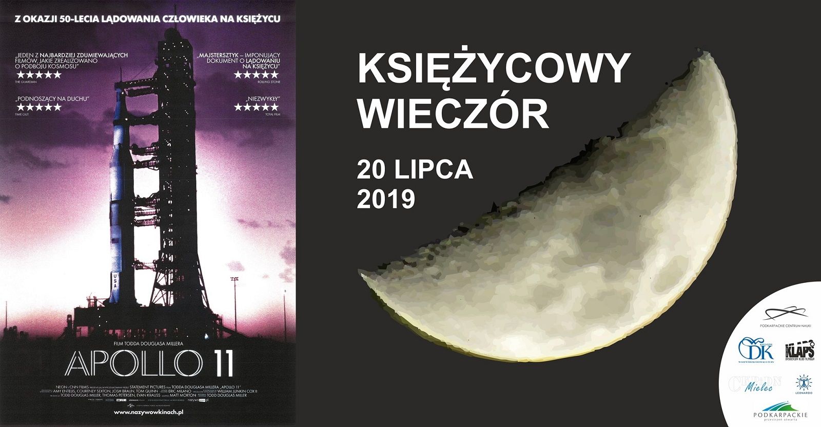Wojewódzki Dom Kultury w Rzeszowie, Podkarpackie Centrum Nauki i Dyskusyjny Klub Filmowy „Klaps” we współpracy z Centrum Kształcenia Praktycznego i Doskonalenia Nauczycieli w Mielcu zapraszają 20 lipca 2019 r. (sobota) na „Księżycowy Wieczór” organizowany z okazji 50-lecia lądowania człowieka na Księżycu.