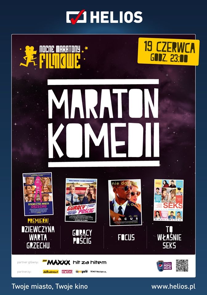 Cykl Nocne Maratony Filmowe przygotował dla wszystkich entuzjastów dobrej zabawy wybór najlepszych tegorocznych komedii! Na dobry początek zobaczyć będzie można premierowo film w gwiazdorskiej obsadzie: „Dziewczyna warta grzechu”, następnie: zwariowany „Gorący pościg”, intrygujący „Focus”, a na zakończenie film przełamujący tabu z przymrużeniem oka - „To właśnie seks”!