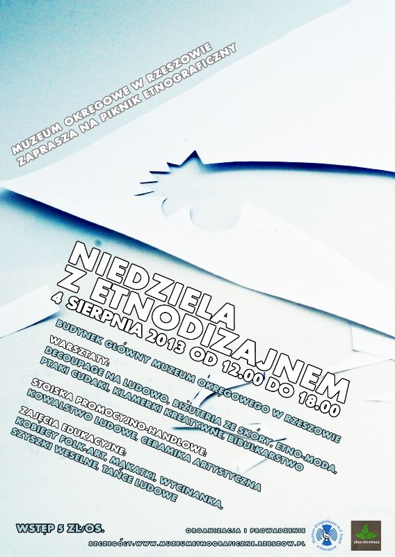 Z myślą o najmłodszych odbędą się warsztaty rozwijające umiejętności rękodzielnicze, podczas których można będzie wykonać fantazyjnego ptaka-dziwaka, prostą ludową zabawkę lub zaprojektować i przyozdobić ludowe korale, a także poznać tajniki decoupage-u. W „Kąciku Malucha” dziecko pobudzi wodze fantazji ubierając papierową laleczkę w strój ludowy. Etno-moda to oferta zabawy dla mam, które chciałyby oderwać się na chwile od codzienności i przenieść w świat wyobraźni. W formie instruktażu pokażemy, w jaki sposób poprzez nutę ludową odświeżyć ulubioną sukienkę, spodniczkę, bluzkę, która może troszkę się nam już znudziła… Kwiaty z bibuły, to z kolei świat naszych babek i prababek. Zaglądając do babcinego kufra wspólnie podpatrzymy sposoby wykonywania papierowych kwiatów, które przecież mogą być inspiracją w zdobnictwie odzieżowym. Dla Panów niedzielne popołudnie będzie okazją wykonania biżuterii ze skóry i poznania tajników jej wyprawiania i zdobnictwa.