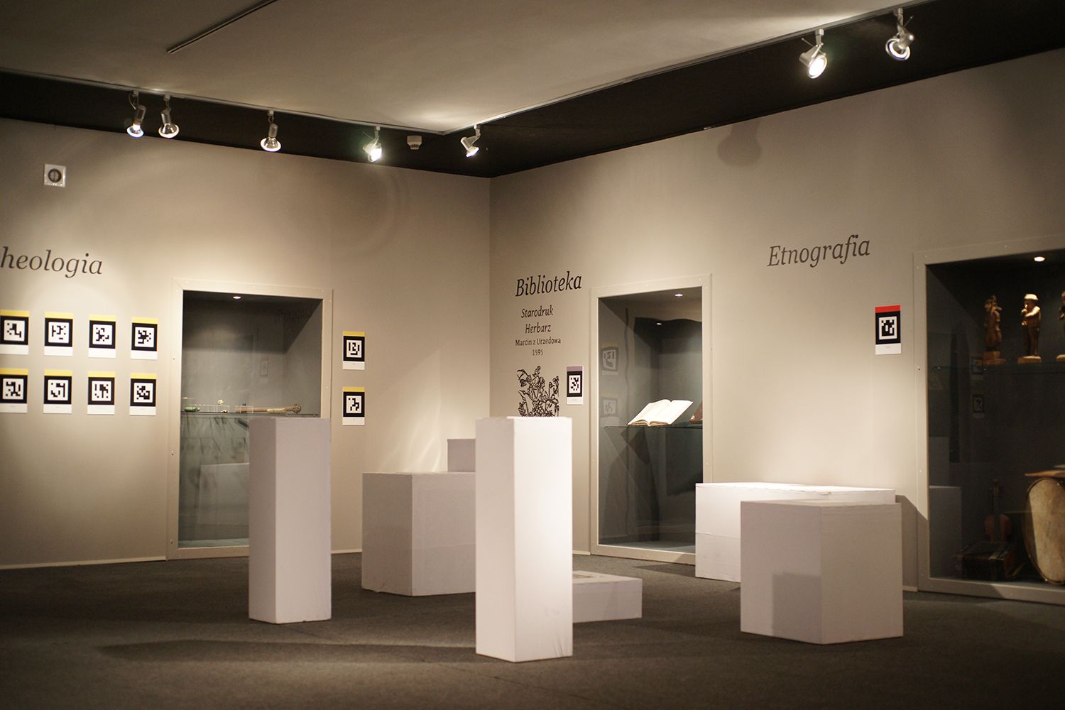 Eksponaty zostały ukryte na wystawie w postaci kodów AR, które skanujemy korzystając z urządzeń mobilnych. Na ekranie pojawi się szereg informacji, nie tylko tekstowych na temat danego eksponatu, ale również animacje, filmy, muzyka, ilustracje, zdjęcia oraz eksponaty w wersji cyfrowej - 3D.