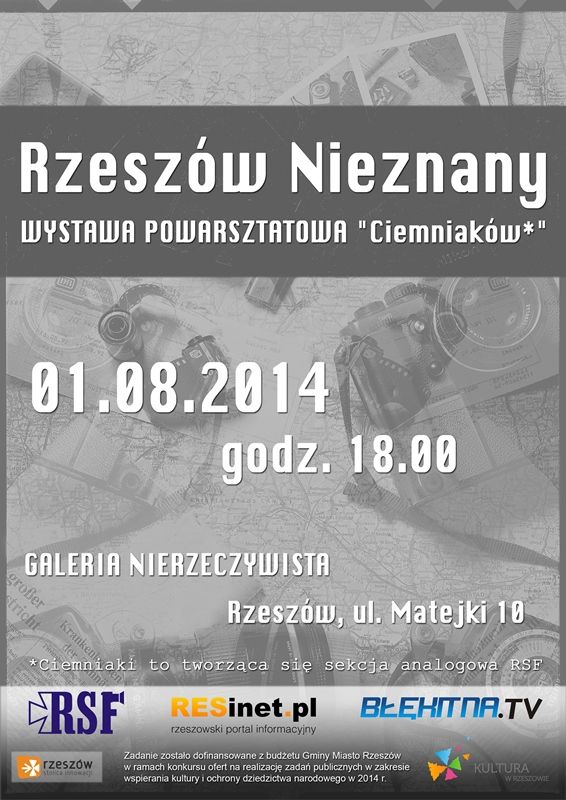Wystawa "Rzeszów Nieznany" jest efektem warsztatów fotografii analogowej zorganizowanych przez RSF Rzeszowskie Stowarzyszenie Fotograficzne. Podczas wernisażu wystawy oglądać będzie można wykonane własnoręcznie przez uczestników warsztatów odbitki srebrowe ukazujące Rzeszów, o którego istnieniu być może nie mieliście Państwo pojęcia. Serdecznie zapraszamy do świata czarno - białych snów o Rzeszowie..