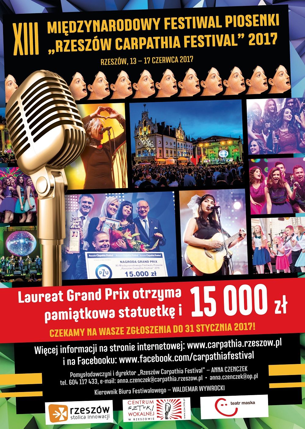 W ubiegłym roku na „Rzeszów Carpathia Festival” napłynęła rekordowa ilość zgłoszeń z całej Polski i świata. Do finału zakwalifikowało się 11 solistów występujących z towarzyszeniem Orkiestry Festiwalowej i 9 zespołów reprezentujących państwa takie jak: Słowacja, Ukraina, Litwa, Białoruś, Polska, Norwegia, Włochy, Czechy i Kanada. W tym roku program festiwalu jak zwykle stworzony został z myślą o całych rodzinach – dlatego już od wtorku 13 czerwca 2017 r. na rzeszowskim Rynku odbędzie się wiele atrakcyjnych, spektakularnych wydarzeń skierowanych do dzieci, ich rodzin oraz do wielu mieszkańców Podkarpacia reprezentujących każde pokolenie. Tradycyjnie zaprezentowany zostanie program niemal wszystkich rzeszowskich Przedszkoli pn. „Przedszkolaki Miastu”, w którym udział bierze około 2000 dzieci. Ze swoim koncertem wystąpi również laureatka Nagrody Grand Prix „Rzeszów Carpathia Festival” 2016 – Anna Cyzon z Kanady. Podczas kolejnych dni festiwalu zaprezentują się również zwycięzcy oraz laureaci telewizyjnych programów talent show: Alicja Rega – nagrodzona za najlepszy głos I edycji programu „Mali Giganci” oraz Ania Dąbrowska – która zajęła czołowe miejsce w Krajowym Finale Eurowizji dla Dzieci 2016. Ponadto wystąpią również uczestnicy i finaliści programu TVP 1 „Hit Hit Hurra!” – Oliwia Skóra, Alicja Rega, Aleksandra Kędra i Dominik Tudryn.