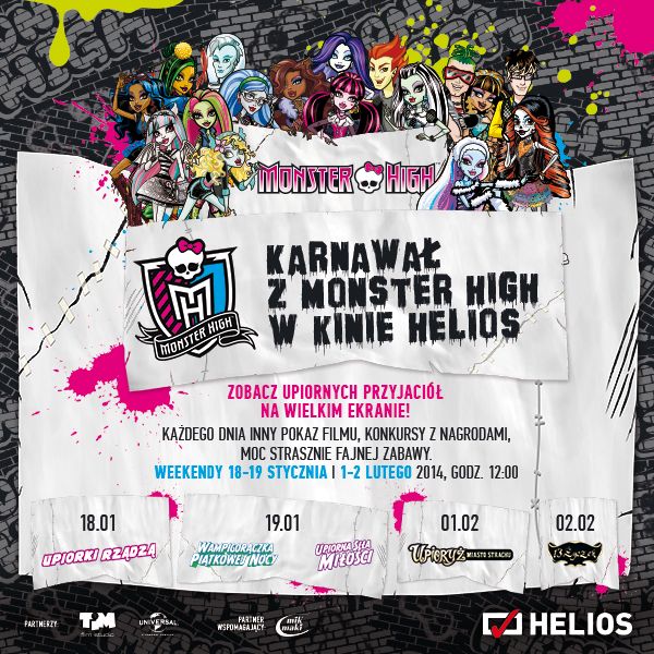 Przed seansem można będzie wygrać lalki, płyty DVD, słodycze, książki oraz magazyny z kolekcji MH. By wziąć udział w konkursie fotograficznym organizowanym we współpracy z Wydawnictwem Egmont wystarczy zadbać o tematyczną charakteryzację w stylu Monster High. Najlepsze kreacje będą miały szansę znaleźć się na stronie helios.pl oraz w magazynie Monster High.