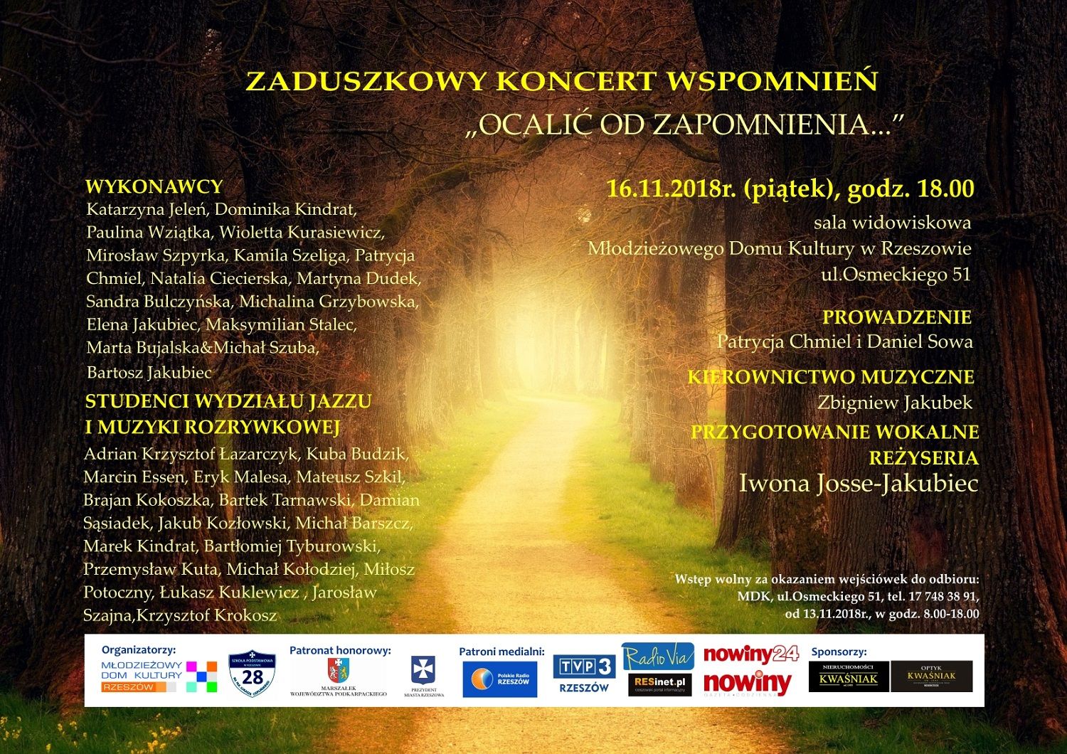 Młodzieżowy Dom Kultury w Rzeszowie oraz Szkoła Podstawowa Nr 28 w Rzeszowie zapraszają na Zaduszkowy Koncert Wspomnień pt. "Ocalić od zapomnienia".
