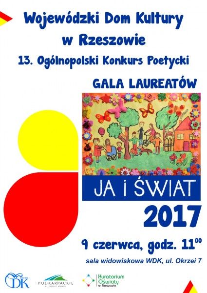 9 czerwca o godz. 11 w Sali widowiskowej Wojewódzkiego Domu Kultury w Rzeszowie (ul. Okrzei 7) odbędzie się Gala Laureatów 13. Ogólnopolskiego Konkursu Poetyckiego ŚWIAT I JA.