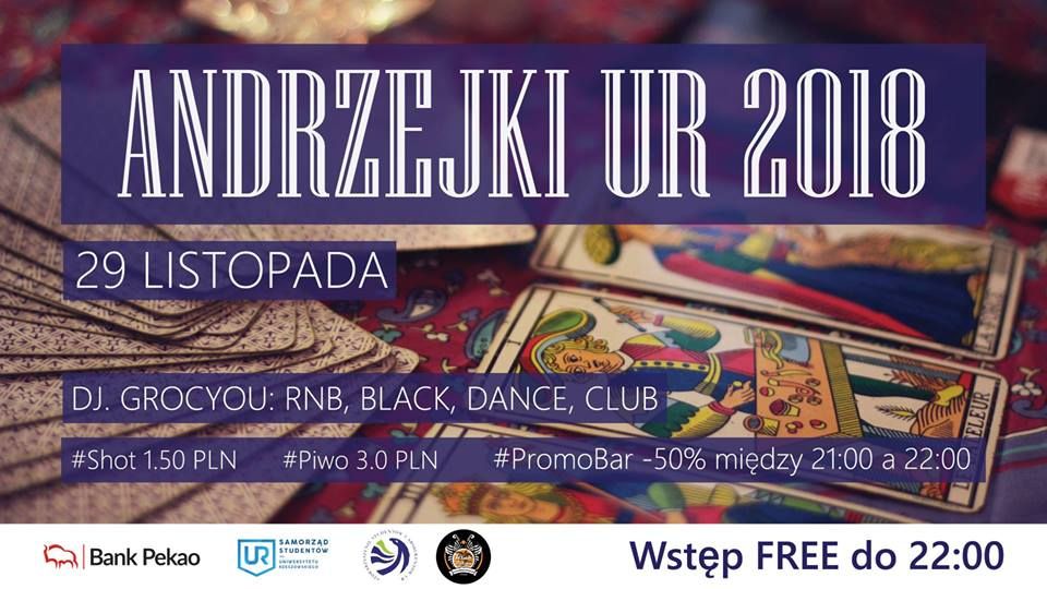 Samorząd Studentów Uniwersytetu Rzeszowskiego zaprasza wszystkich studentów na Andrzejki Uniwersytetu Rzeszowskiego, które odbędą 29 listopada w Klubie Pod Palmą.