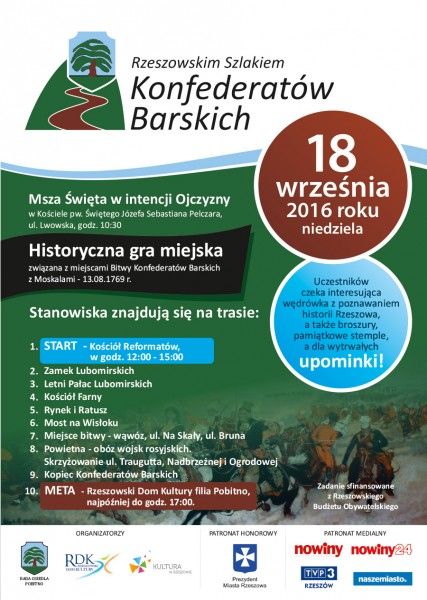 Historyczna gra miejska „Rzeszowskim Szlakiem Konfederatów Barskich” odbędzie się 18 września 2016 roku. Uroczyste rozpoczęcie wydarzenia nastąpi o godzinie 10:30 w Kościele pw. św. Józefa Sebastiana Pelczara, gdzie zostanie odprawiona msza święta w intencji Ojczyzny. Pierwszym punktem na szlaku będzie Kościół Garnizonowy w Rzeszowie – dawny Kościół Reformatów, gdzie uczestnicy muszą pojawić się w godzinach 12:00 – 15:00. Meta, na którą uczestnicy będą musieli dotrzeć najpóźniej do godziny 17:00, będzie usytuowana w Rzeszowskim Domu Kultury filia „Pobitno”.