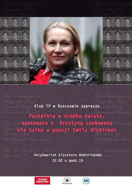 Spotkanie z Krystyną Lenkowską – rzeszowską poetką, pisarką, tłumaczką, autorką kilkunastu książek przetłumaczonych na wiele języków. Posłuchamy i porozmawiamy o radości tworzenia, o poezji, o zakochaniu w wierszach Emily Dickinson i ich tłumaczeniu, o przemijaniu, o niemożliwości rozrachunku z własnym życiem i dotarciu do prawdy drugiego człowieka, o tym, od czego uciekamy i gdzie się chronimy.