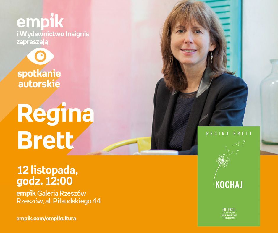 „Bóg nigdy nie mruga” czy „Jesteś cudem” to książki, dzięki którym Regina Brett trafiła na listę bestsellerowych autorów New York Times'a. Jej książki, przetłumaczone dotąd na 25 języków, zaskarbiły sobie serca czytelników na całym świecie. Autorka kieruje je do osób chcących zmienić sposób patrzenia na siebie i świat. W związku z premierą książki „Kochaj” (Insignis) Regina Brett spotka się z publicznością już 12 listopada w Empiku w Galerii Rzeszów (spotkanie odbędzie się na placu eventowym Galerii Rzeszów). Spotkanie rozpocznie się o godz. 12:00.