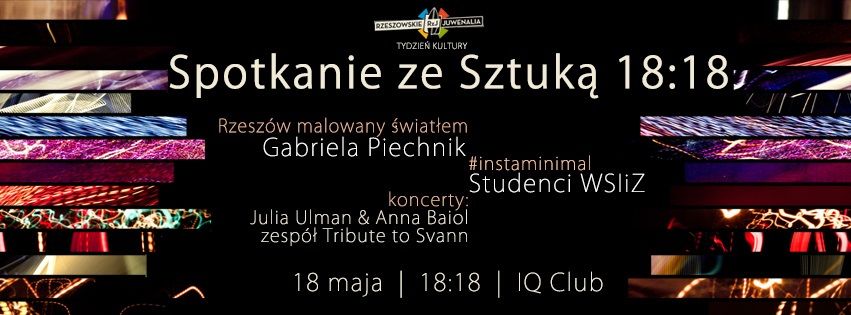 Spotkanie rozpocznie się tradycyjnie o 18:18 w IQ Club (WSIiZ) wernisażem dwóch wystaw. „Rzeszów malowany światłem” autorstwa Gabrieli Piechnik (wykładowczyni WSIiZ), to zbiór fotografii ukazujących Rzeszów z niecodziennej perspektywy. Zdjęcia wykonane nocą, z długim czasem naświetlania, przeobraziły się w abstrakcyjne obrazy niczym spod świetlnego pędzla. Przedstawiają miejsca, które prawdopodobnie większość mieszkańców doskonale zna, ale czy na zdjęciach wyglądają równie znajomo? Warto przekonać się o tym osobiście.