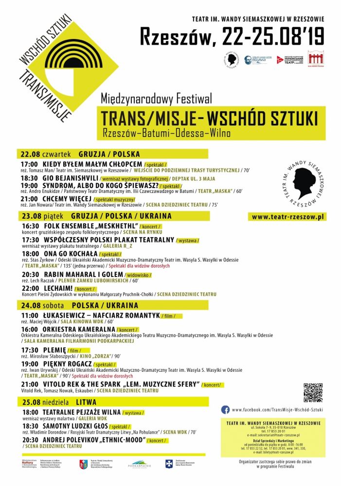 Teatr im. Wandy Siemaszkowej w Rzeszowie zaprasza na kolejne międzynarodowe wydarzenie artystyczne. Ubiegłoroczny Międzynarodowy Festiwal Sztuk TRANS/MISJE Rzeszów–Koszyce–Ostrawa–Debreczyn–Lwów-Troki cieszył się ogromnym zainteresowaniem rzeszowskiej publiczności i przyjezdnych. Międzynarodowy Festiwal TRANS/MISJE – WSCHÓD SZTUKI Rzeszów-Batumi-Odessa-Wilno, który rozpocznie się 22 sierpnia tego roku, jest więc kolejną odpowiedzią rzeszowskiej sceny na potrzeby mieszkańców Podkarpacia i turystów odwiedzających w wakacje stolicę województwa.