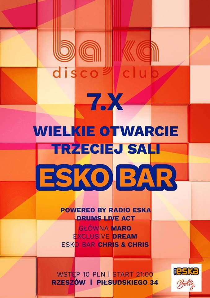 Wielkie otwarcie 3 tanecznej sali: ESKO BAR. W każdą weekendową sobotę nie będziemy już bawić się na 2 ale na 3 parkietach tanecznych! ESKO BAR to sala, na której grać będziemy klubowe klimaty, które na co dzień możecie usłyszeć w Radio ESKA. To właśnie nasz partner, z którym będziemy grać :) Zapraszamy odiwedźcie nas koniecznie i dajcie znać jak Wam się podoba zabawa na 3 parkietach!