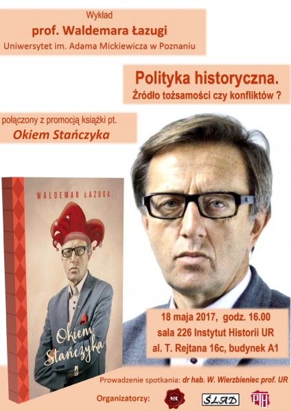 Instytut Historii Uniwersytetu Rzeszowskiego, Regionalne Stowarzyszenie Pamięci Historycznej oraz Polskie Towarzystwo Historyczne Oddział w Rzeszowie zapraszają na wykład prof. Waldemara Łazugi pt. „Polityka historyczna. Źródła tożsamości czy konfliktów?” połączony z promocją książki pt. „Okiem Stańczyka” który odbędzie się 18 maja o godz. 16 w Instytucie Historii Uniwersytetu Rzeszowskiego (al. Rejtana 16 C, bud. A1, s. 226).