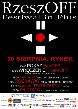 Przed nami wielki finał festiwalu RzeszOFF in Plus. Po 6 filmowych tygodniach zmagań młodych twórców przyszedł czas na podsumowanie i wyłonienie zwycięzców. Ostatnia, kulminacyjna odsłona festiwalu odbędzie się w weekend 29 - 30 sierpnia na rzeszowskim Rynku. Obejmie projekcje filmów, koncerty i premierę spektaklu teatralnego. Organizatorzy jak co roku przygotowali masę atrakcji dla fanów ambitnej sztuki niezależnej.
