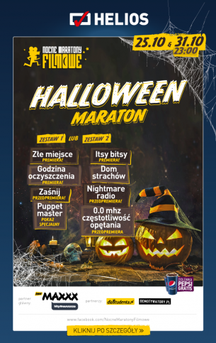 W pierwszym zestawie pokażemy cztery filmy, których jedynym celem jest … śmiertelnie Was wystraszyć! Na początek przerażający horror producentów „Piły” – ZŁE MIEJSCE. Następnie premierowo demoniczna GODZINA OCZYSZCZENIA. Dalej, do zobaczenia wyłącznie w kinach Helios, w dodatku na miesiąc przed światową premierą, doskonale oceniany ZAŚNIJ i na koniec pokaz specjalny PUPPET MASTER - 30.rocznica.