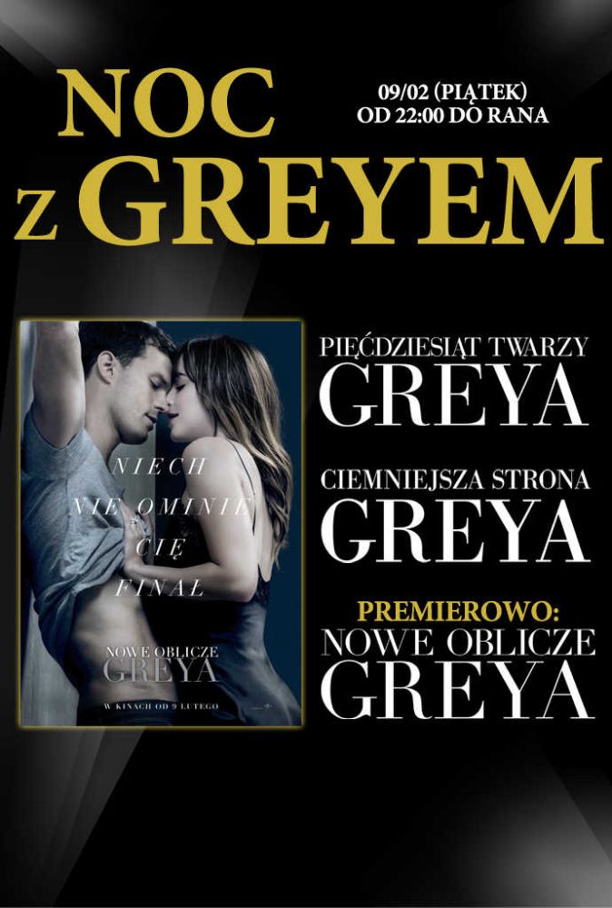 Noc z Greyem to specjalne, ekskluzywne walentynkowe wydarzenie dla wszystkich fanów najbardziej pikantnej i kontrowersyjnej serii ostatnich lat. Tej nocy będzie można obejrzeć wszystkie części trylogii, w tym premierowo najnowszą "Nowe oblicze Greya".